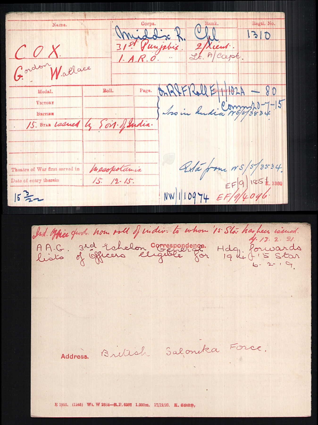 Gordon Wallace-Cox military service, WW1, regimental number 1310