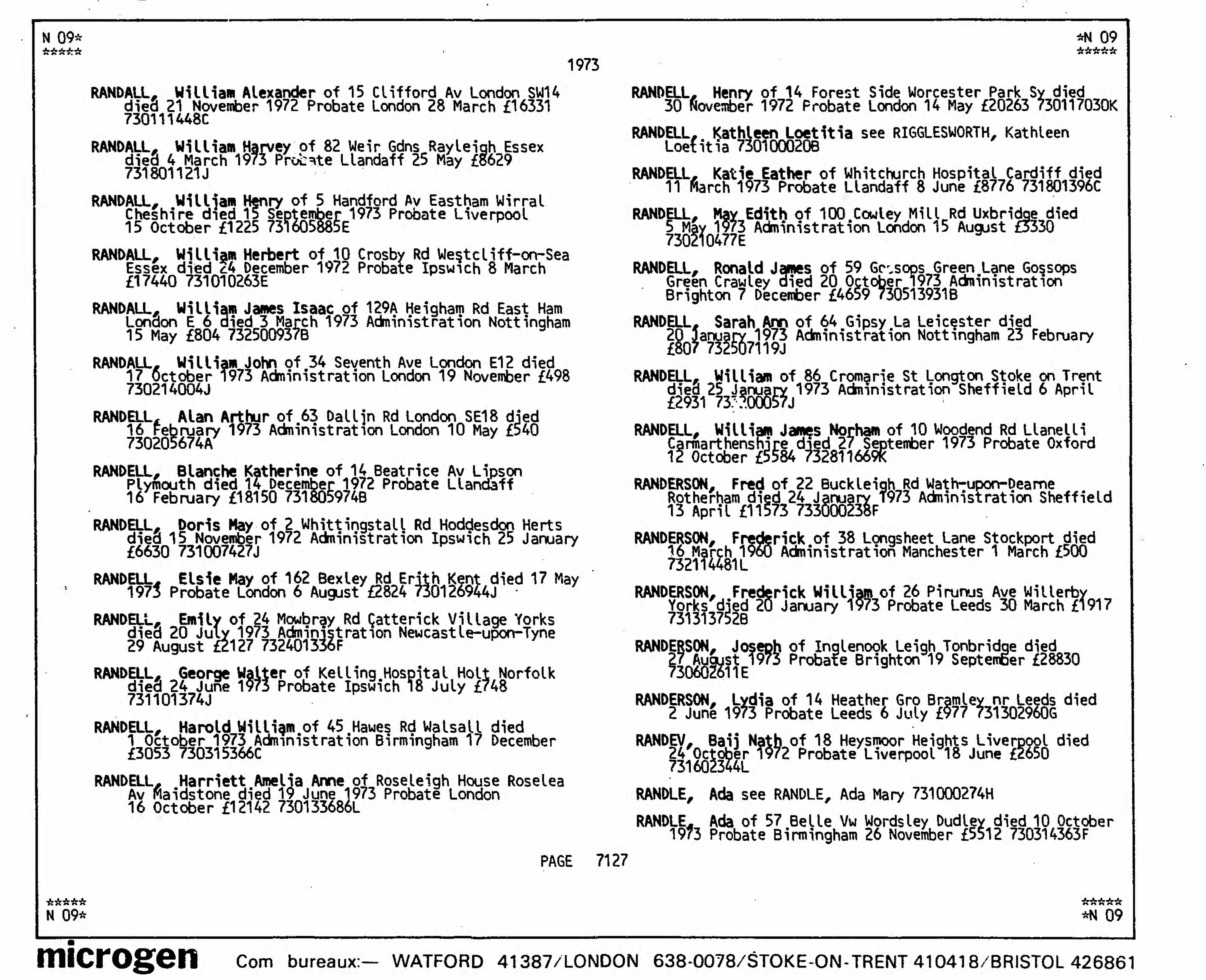Death and probate for Blanche Katherine Randell; Probate Llandaff 16 Feb 1973