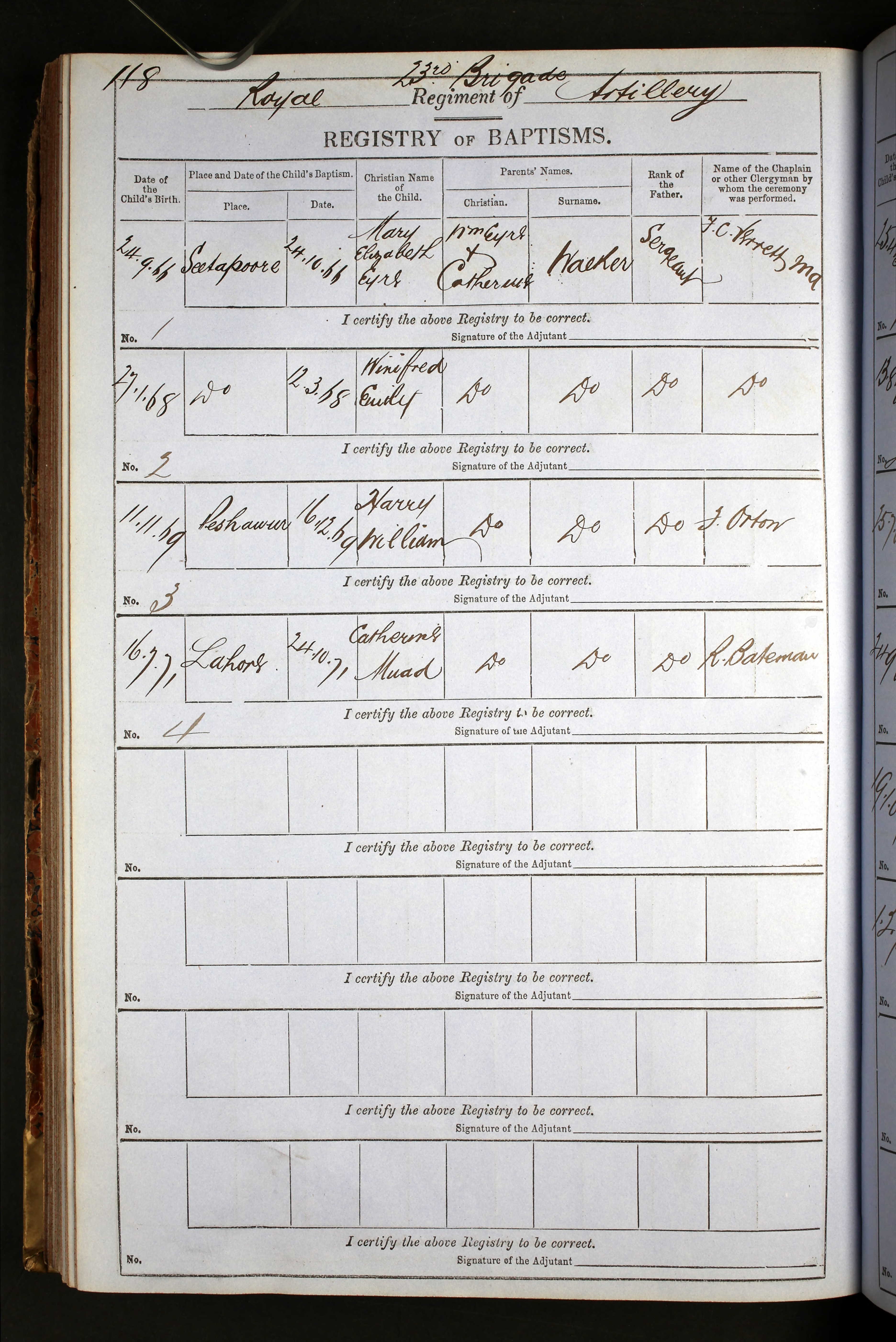 Baptism of Mary Elizabeth Eyre Walker: War Office: Royal Artillery Records of Service and Papers; Class: WO 69; Piece: Piece 577; Piece Description: Piece 577 (1831 - 1877)