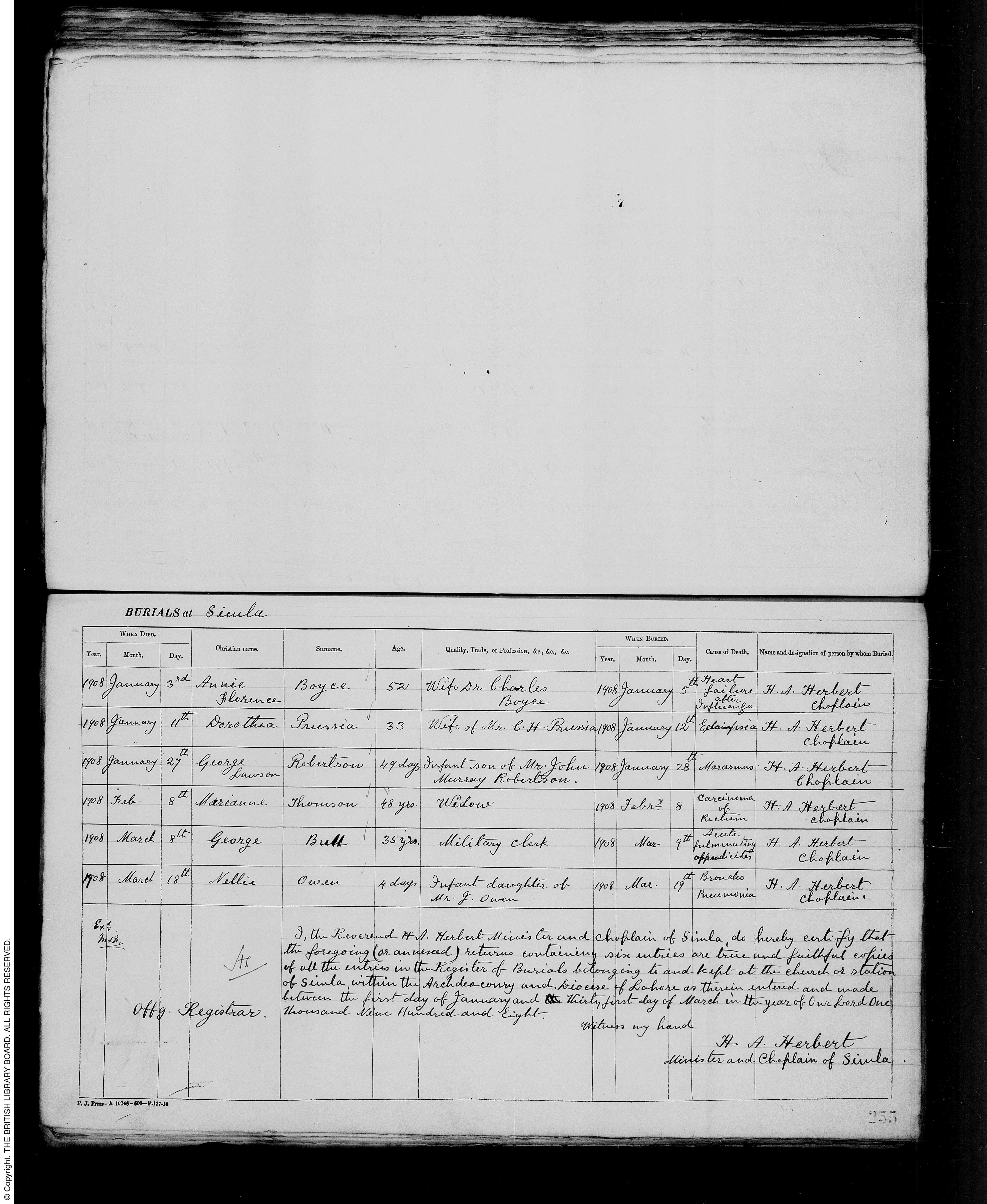 Death and burial of Dorothea Angelo; Birth 1875, age 33; Burial 12 Jan 1908, Simla; Archive N-1-347, page 255