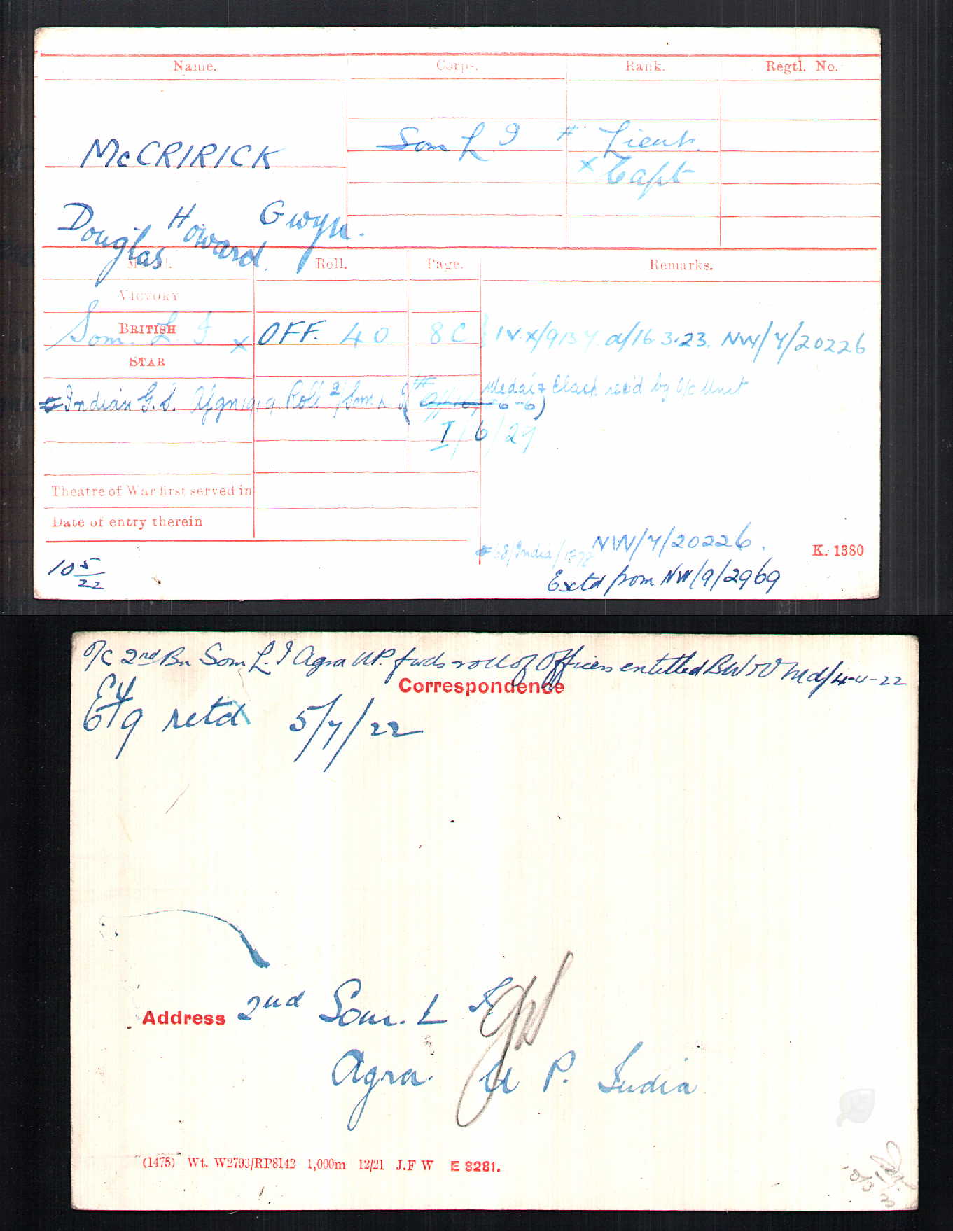 Military service of Douglas H G McCririck within the Somerset Light Infantry. Lieutenant then Captain