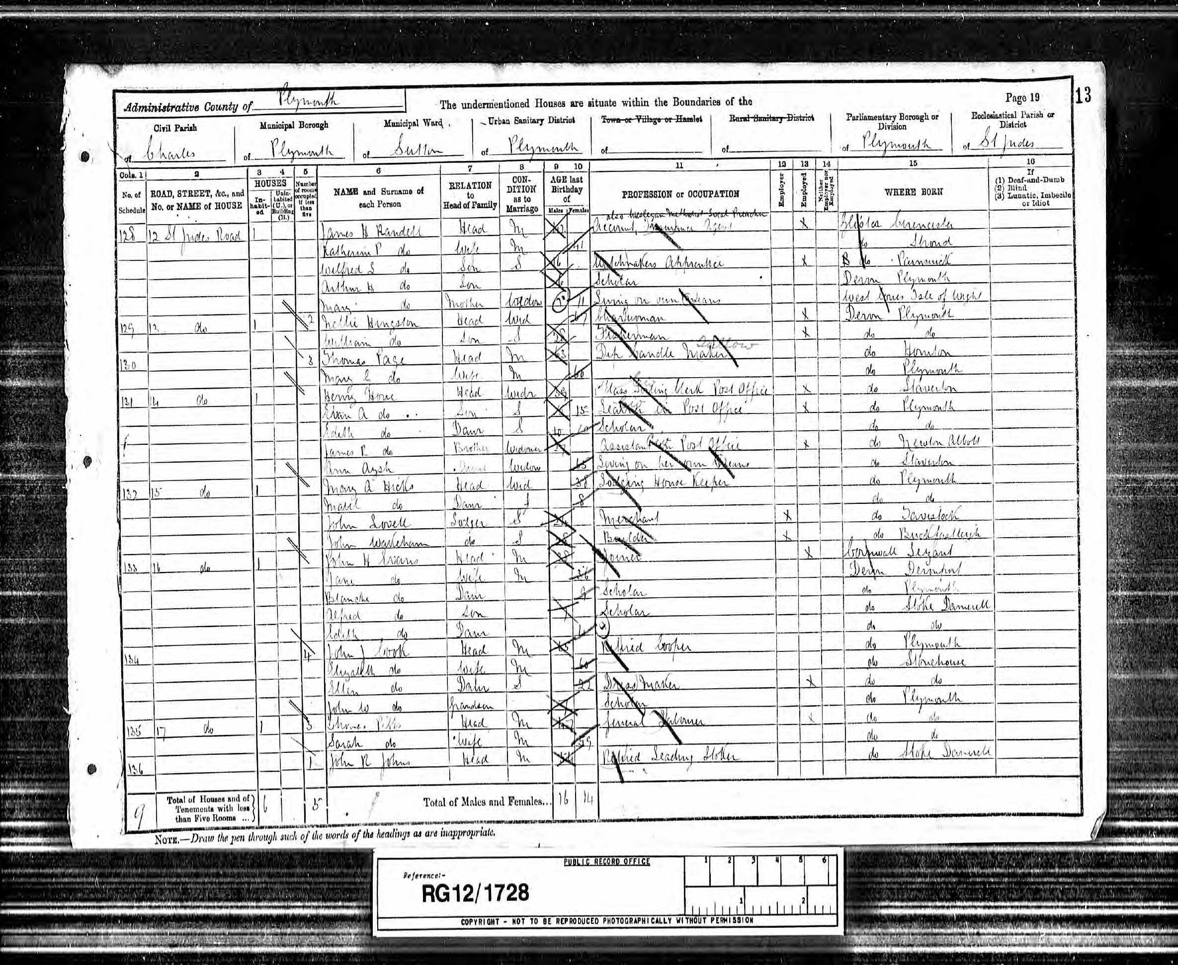 1891 Census: James Hollis Randell (Accountant, Insurance Agent) wife Katherine, mother Mary, two sons: Plymouth; Class: RG12; Piece: 1728; Folio 13; Page 19; GSU roll: 6096838.