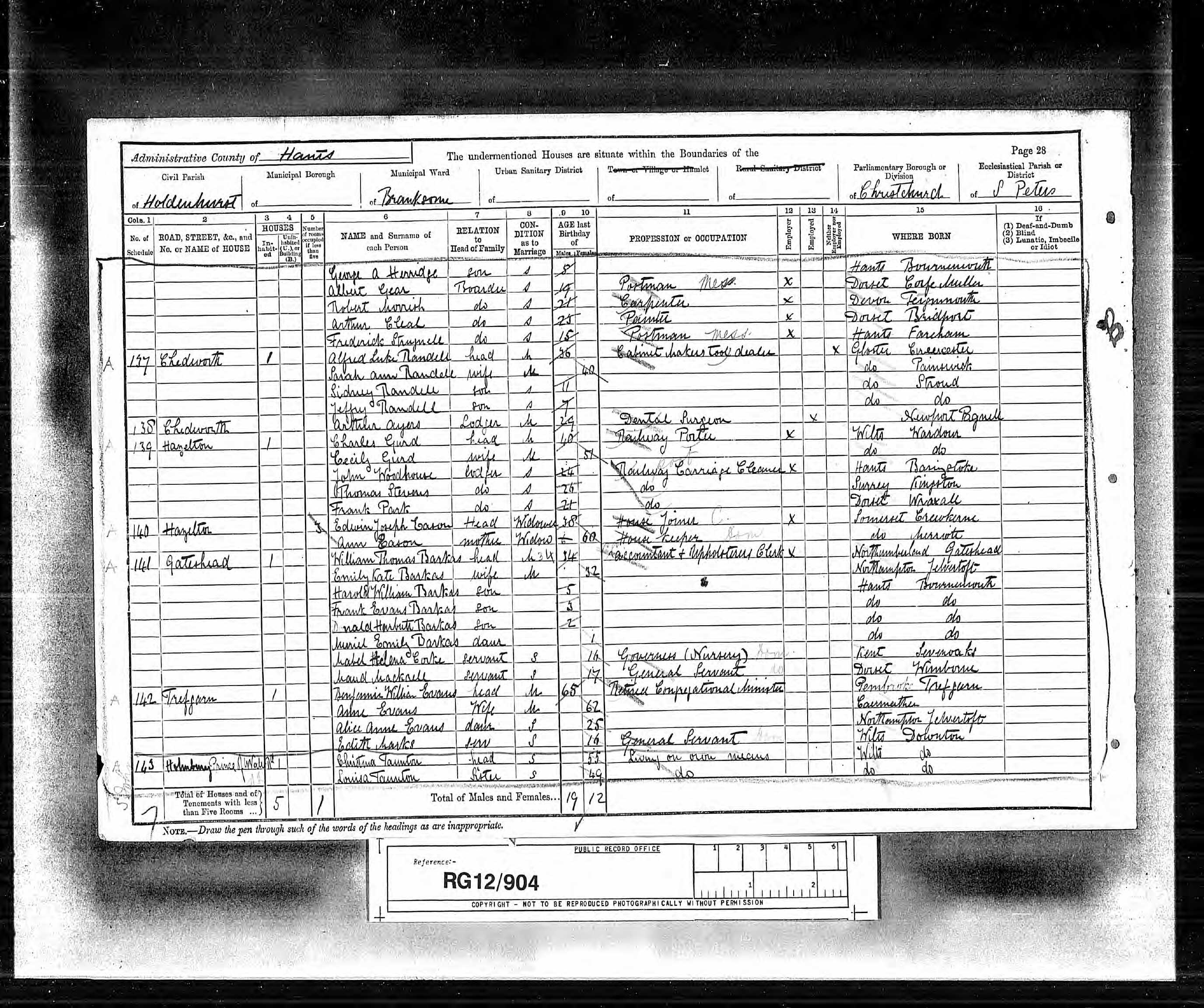 1891 Census - Alfred Luke Randell (Cabinet maker tool dealer), wife Sarah Ann, sons Sydney and Jeffrey: Holdenhurst, Christchurch; Class: RG12; Piece: 904; Folio 122; Page 28; GSU roll: 6096014