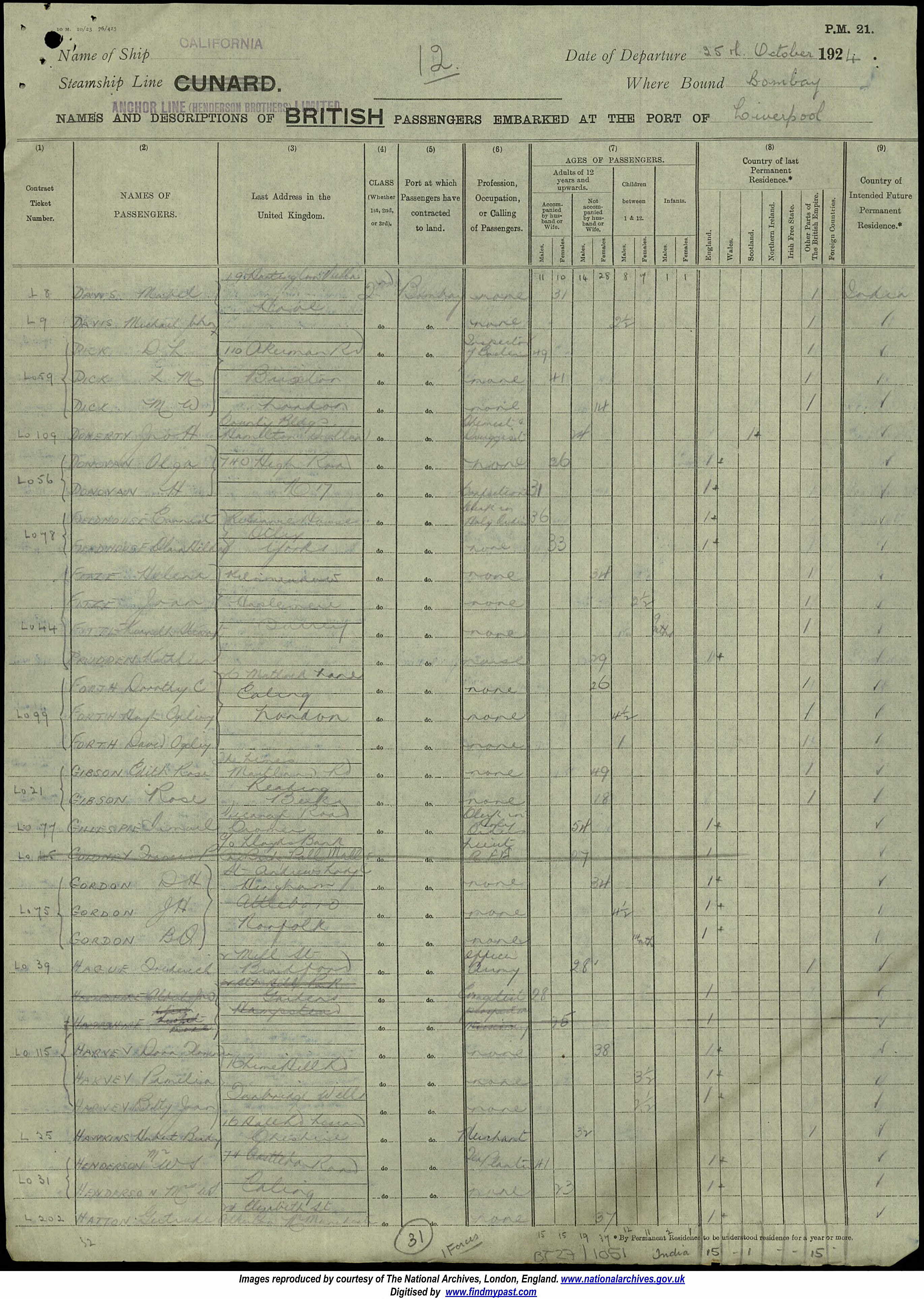 Dorothy Clare Rivett, Liverpool to Bombay, Nov 1924