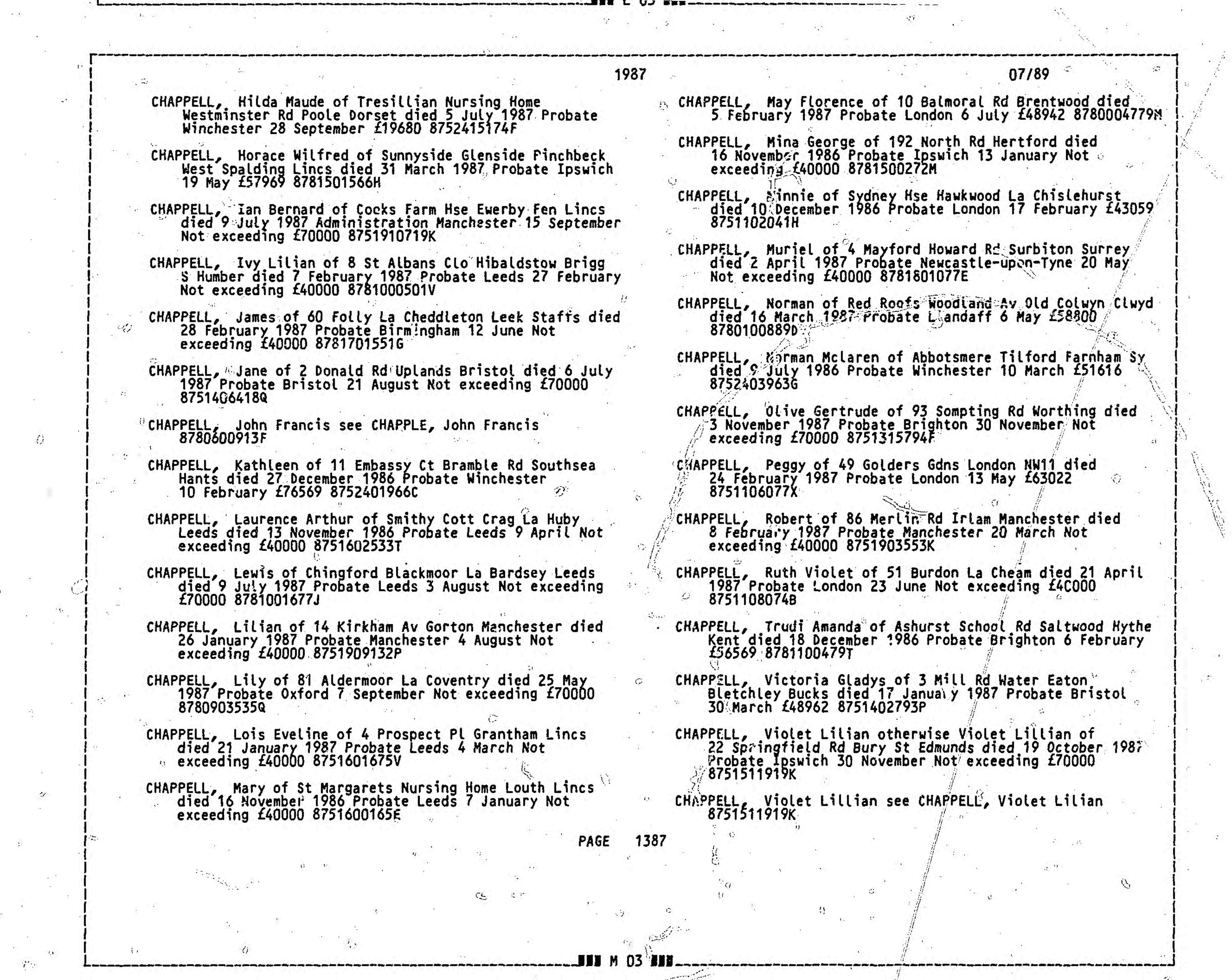 Death of Ian Bernard Chappell; Probate Manchester 15 September 1987; 8751910719K