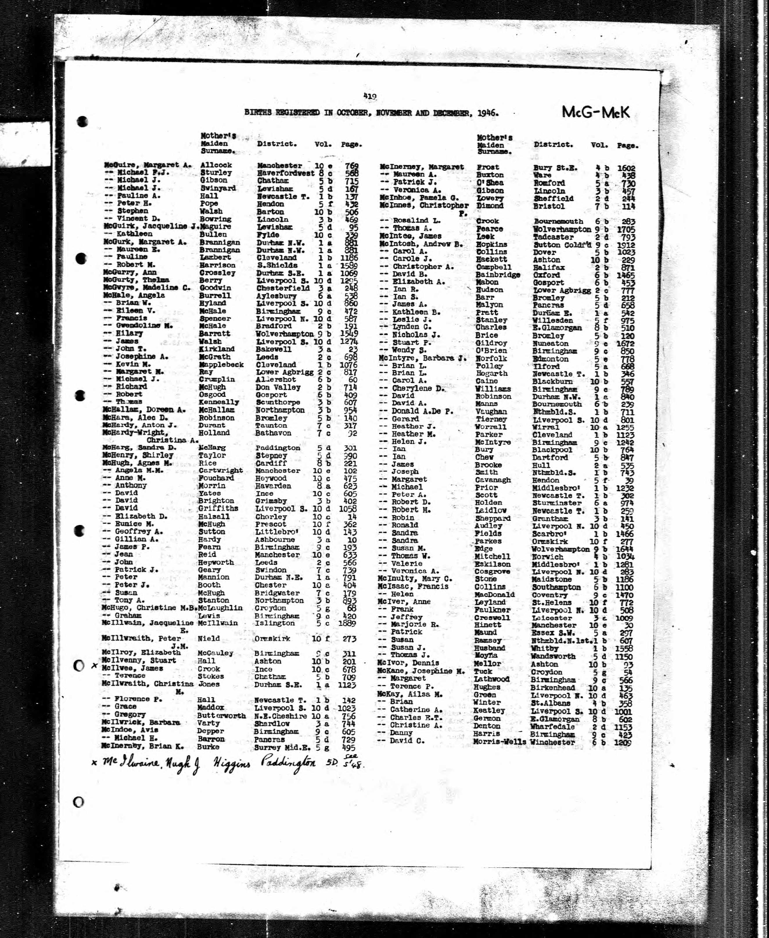 Birth of Nicholas James McIntosh: mother Price (named as Brice): Bromley, volume 5b, page 120