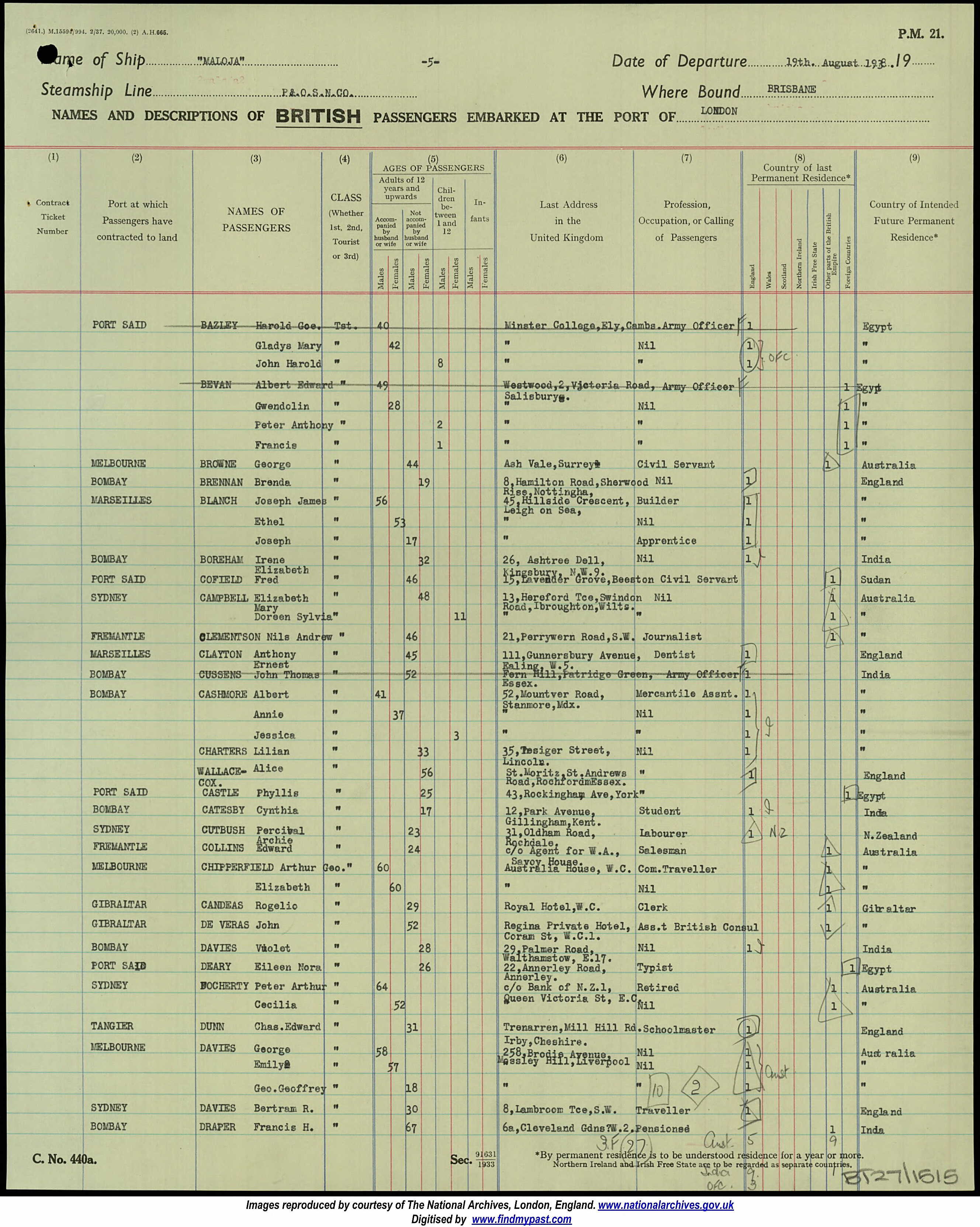 Alice Shields left London on SS Maloja part of the P&O SN Co.