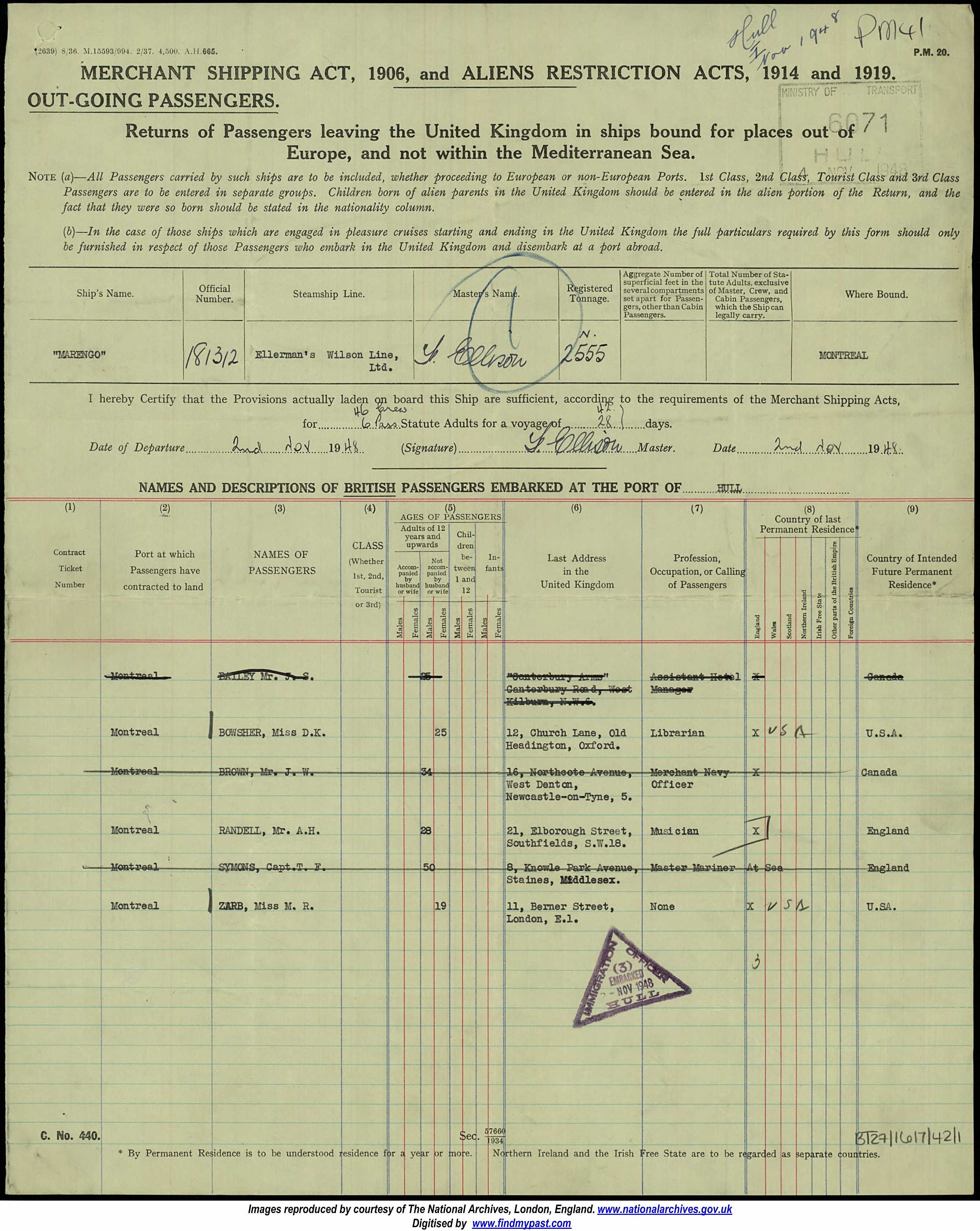 Alfred Hollis Randell from Hull to Montreal on the Marengo, Ellerman's Wilson Line; Master F E Ellison