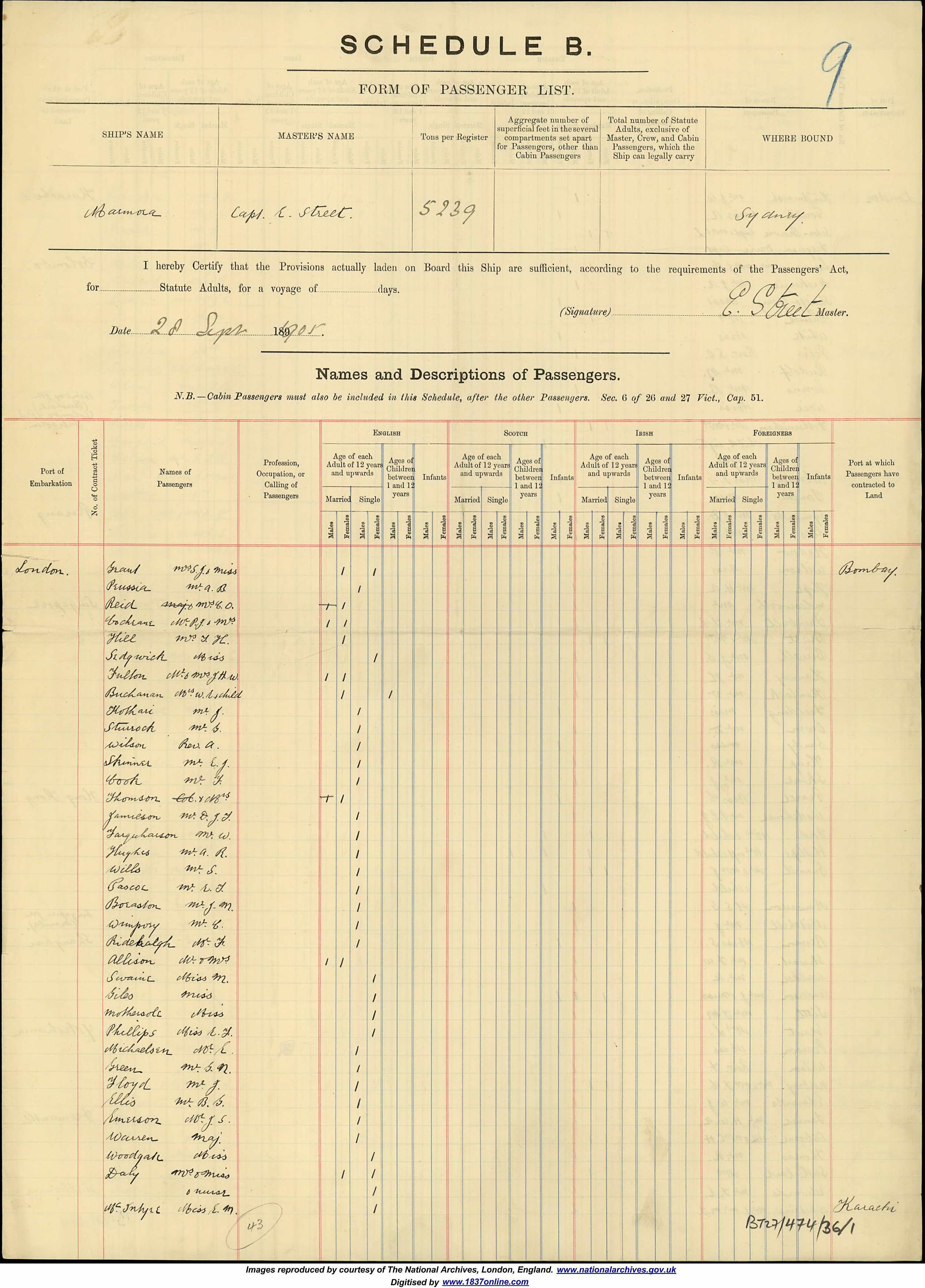 Alfred Bates Prussia left London for Bombay on the SS Marmora Reference Number: Series BT27