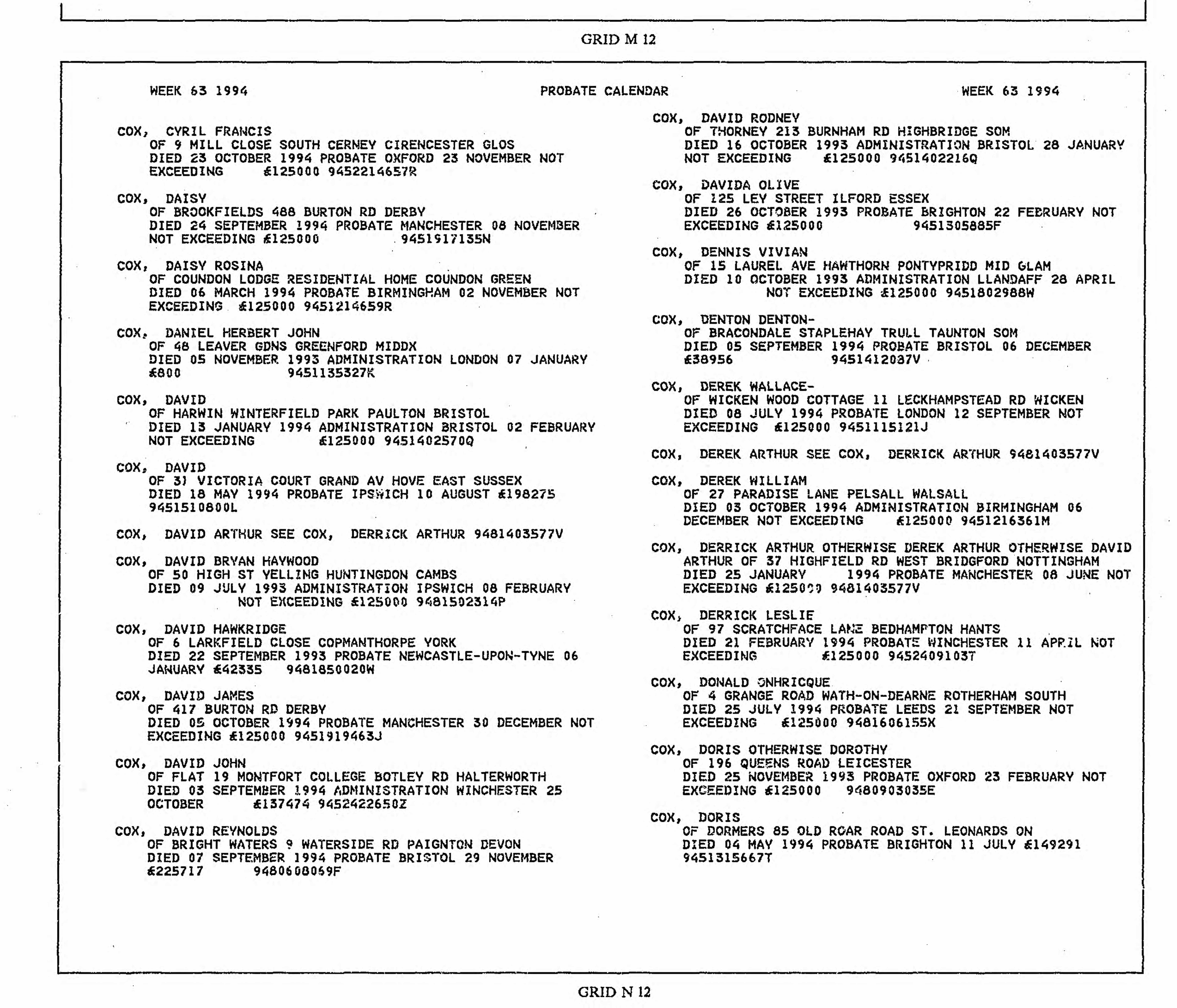 Death and probatge of Derek Wallace-Cox; London, 12 September 1994
