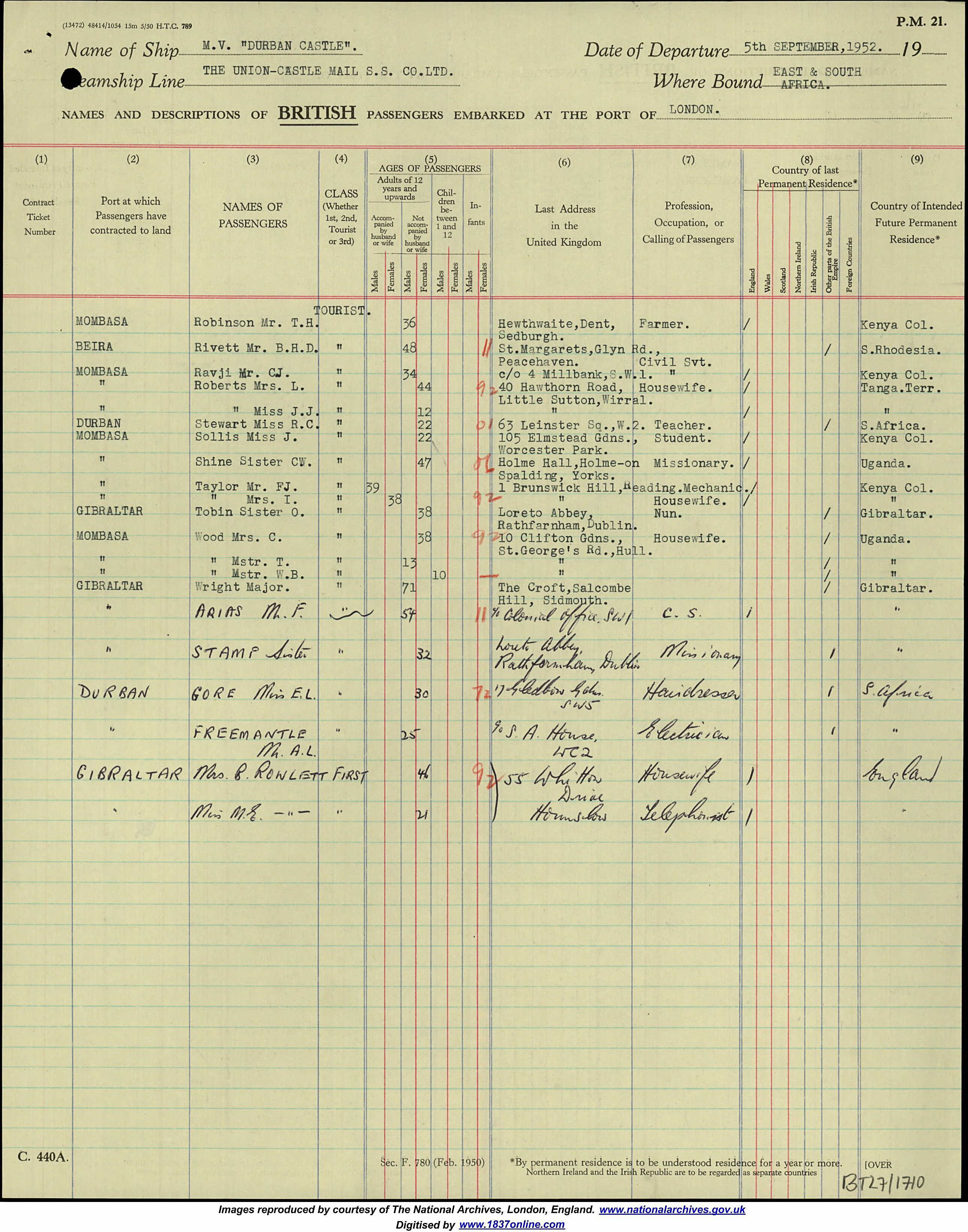 Barnard H D Rivett sailed from London on the MV Durban Castle of the Union-Castle Mail SS Co.