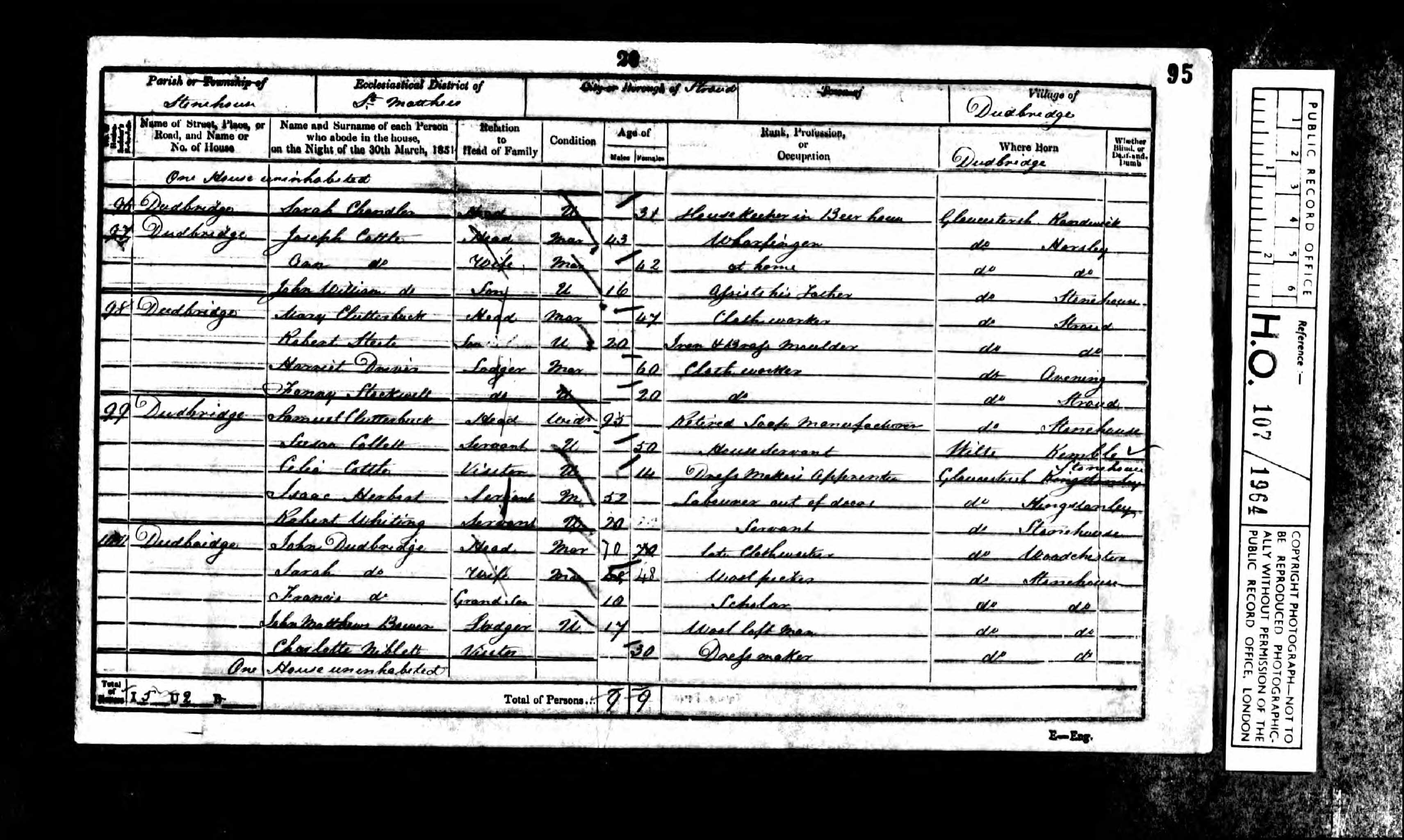 1851 Census - Sarah Niblett (wool picker), with husband John Dudbridge, Grandson Francis, visitor and lodger