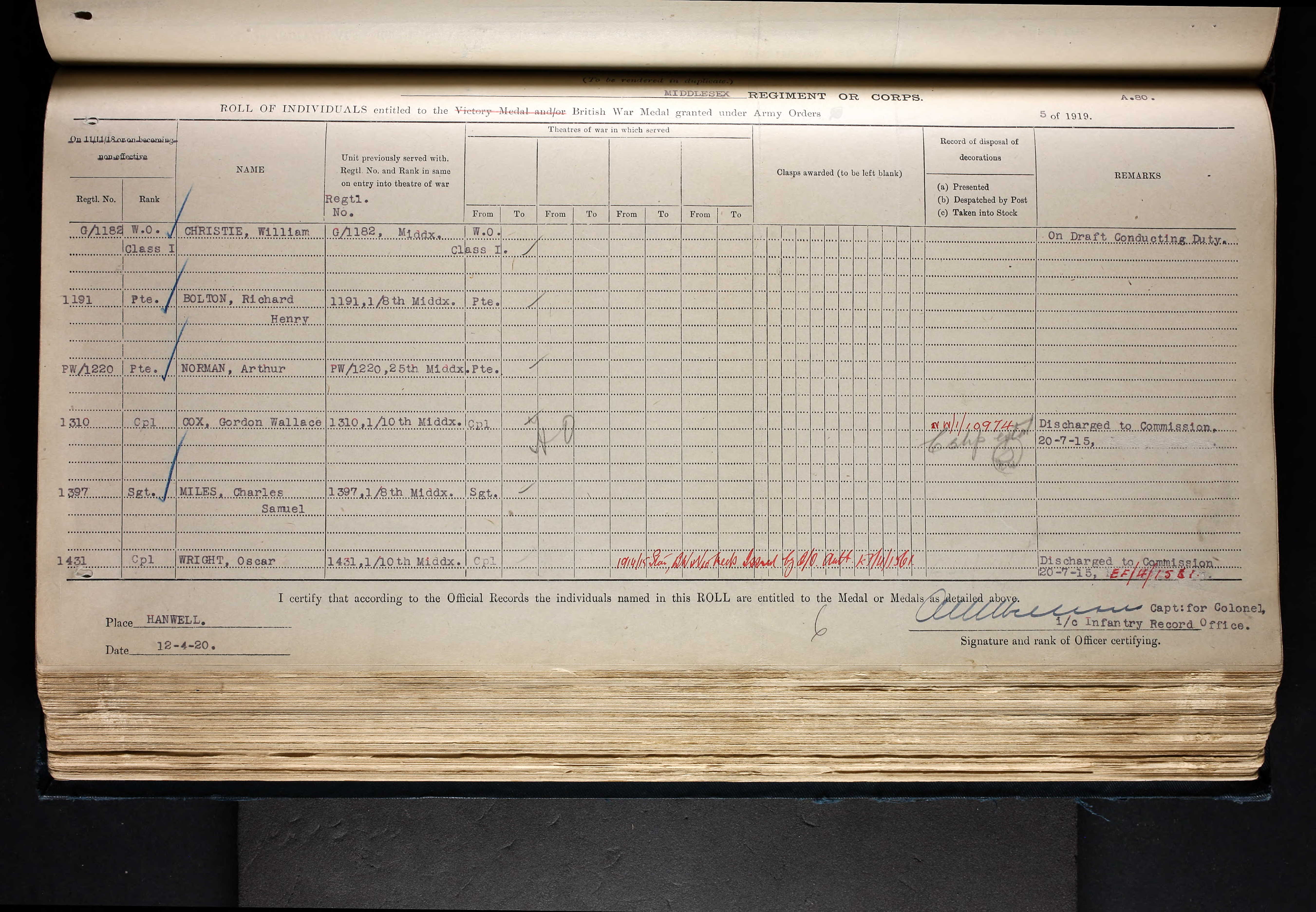 Gordon Wallace-Cox military service, WW1, regimental number 1310