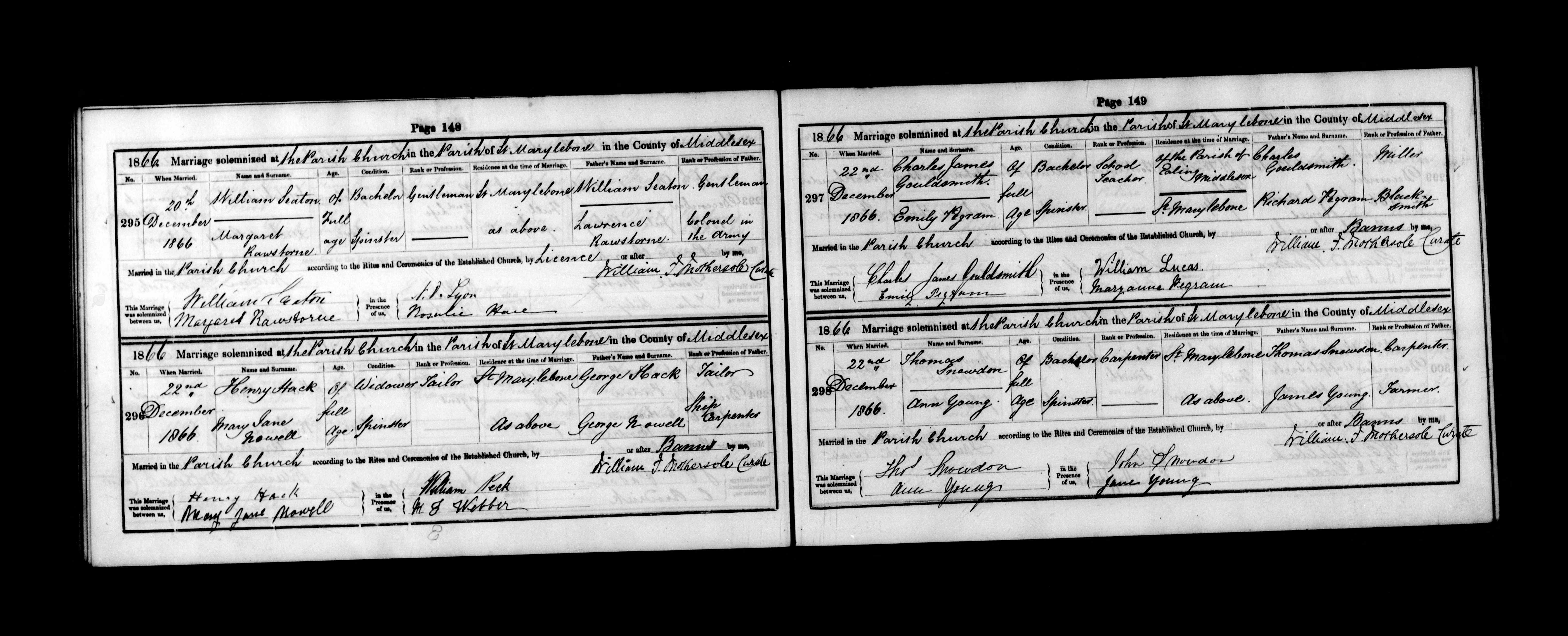Marriage of Charles James Gouldsmith (School Teacher) and Emily Pegram; Father Charles Gouldsmith, miller; "of the parish of Ealing, Middlesex"
