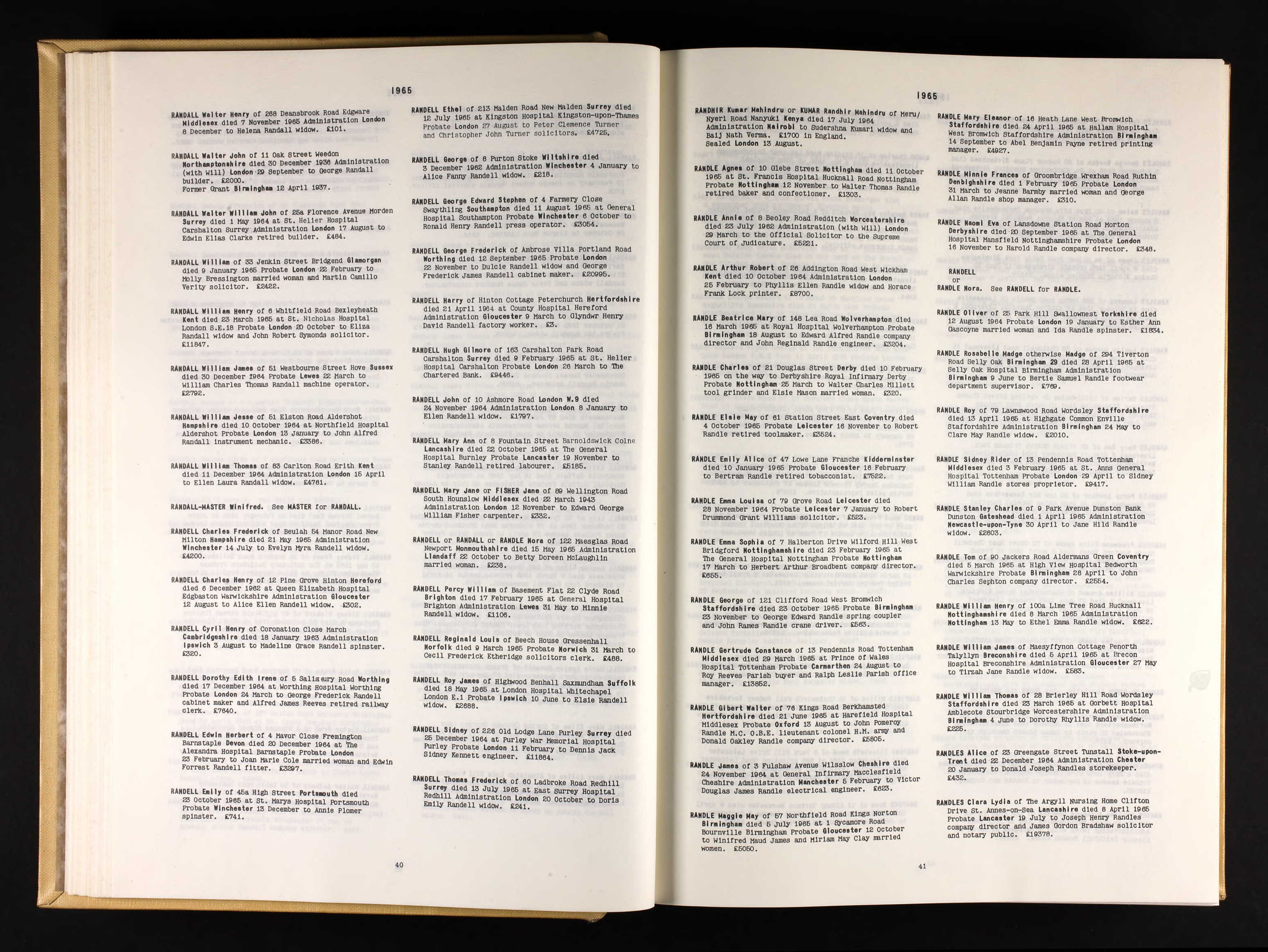Death and probate for Sidney Randell; Probate London 11 Feb 1965